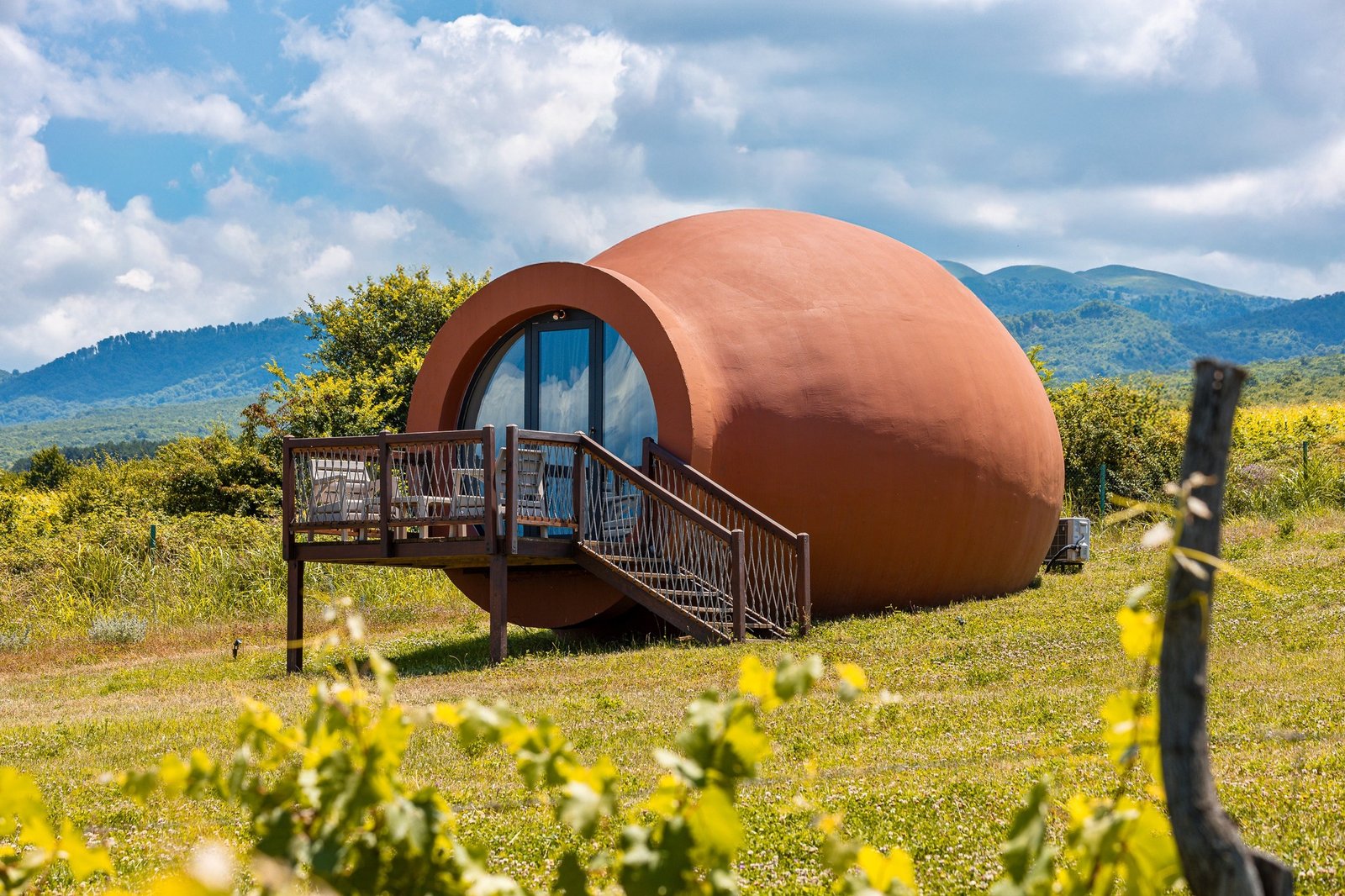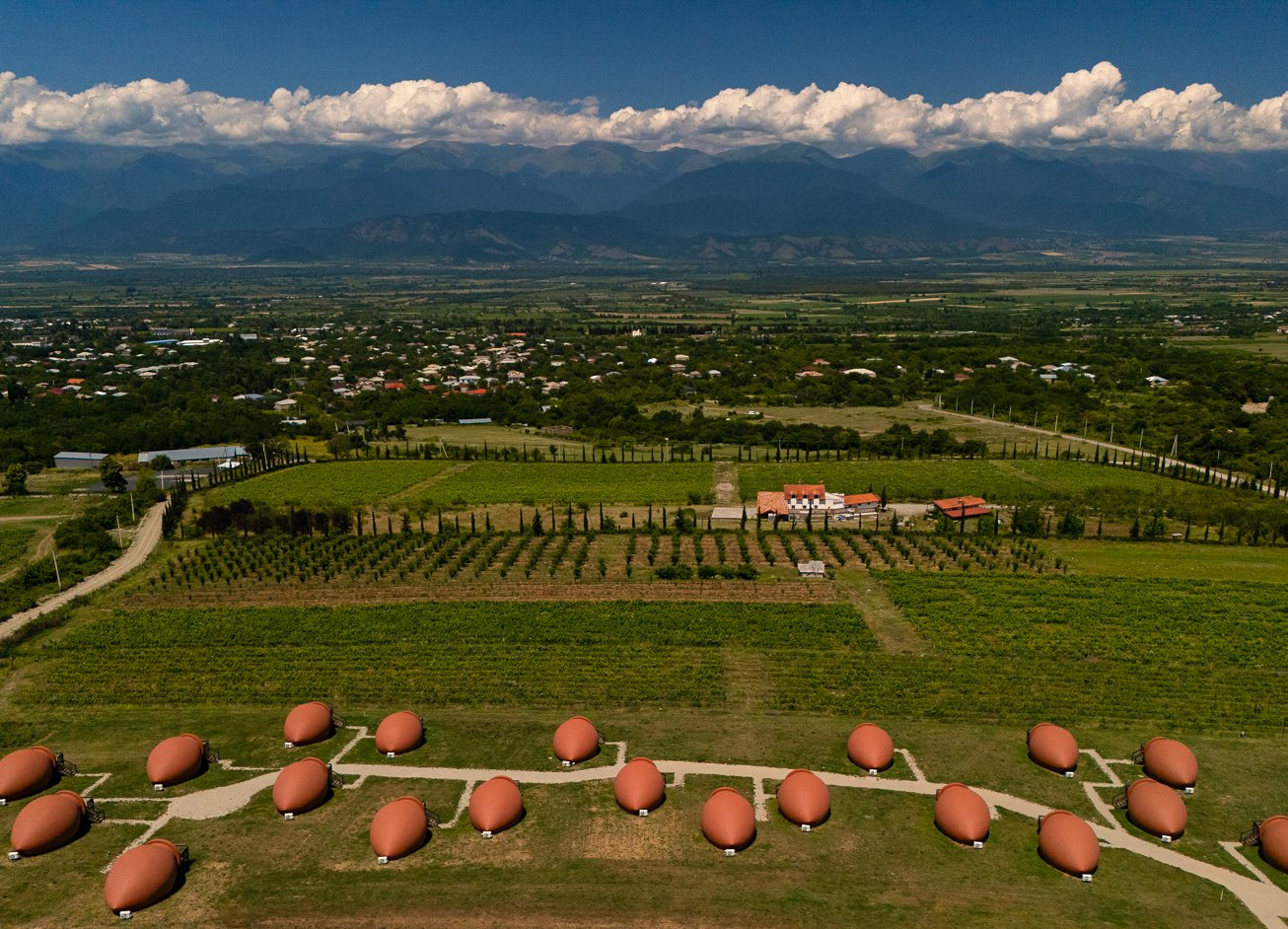 The property also includes a 6,000 m² vineyard (Kisi & Saperavi varieties), a tasting house (110 m²), traditional Georgian wine amphorae (Qvevri), and tea distillery — creating a complete wine-tourism ecosystem.